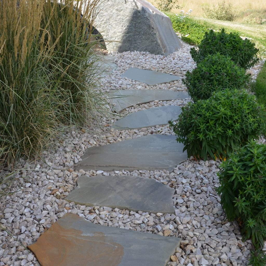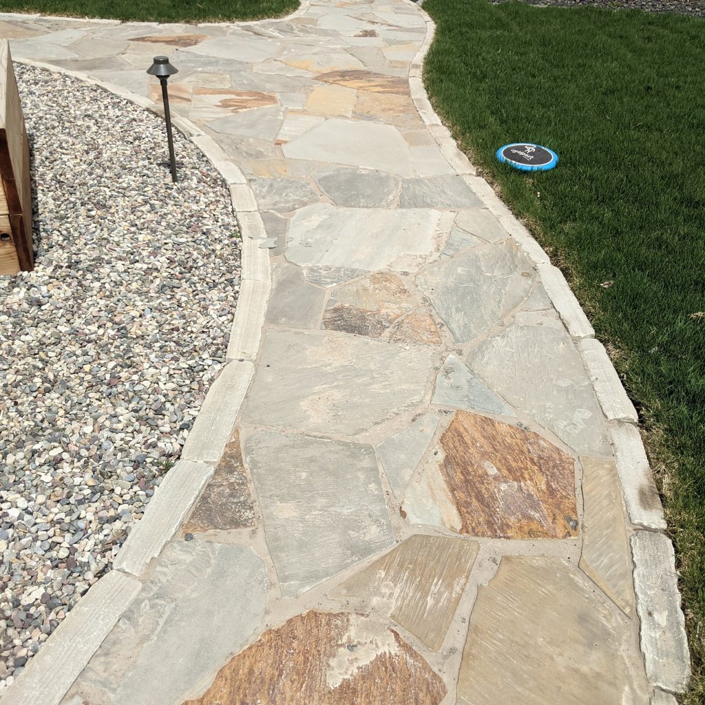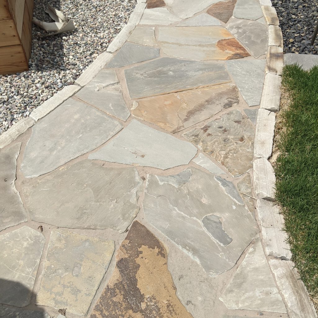 A dense, stable sandstone with predominant greys and varying amounts of additional coloring. Comes in flagstone, tumbled flagstone, tumbled edgers, wall block, treads, and caps or stepping stones.